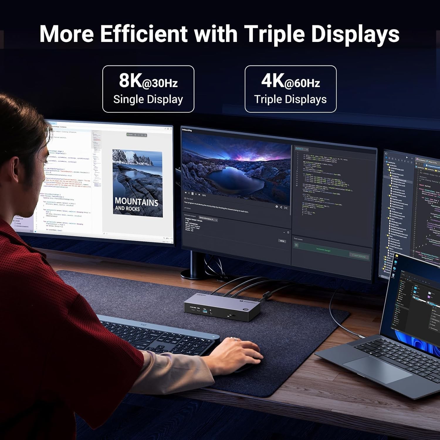 The Ugreen 25085EU Thunderbolt 4 Dock Station is a powerful and versatile hub designed to transform a single Thunderbolt / USB‑C port into a full workstation solution. With support for dual 4K displays, high-speed data transfer, power delivery, and a comprehensive suite of ports—including USB‑A, USB‑C, Ethernet, SD/MicroSD, and audio—this dock facilitates seamless connectivity and productivity. The sleek aluminium design ensures efficient heat dissipation and a premium look, while the EU‑friendly integrated power supply ensures compatibility in European markets. Whether you’re editing, gaming, designing, or running a multi-monitor setup, the 25085EU is engineered to expand your capabilities.
