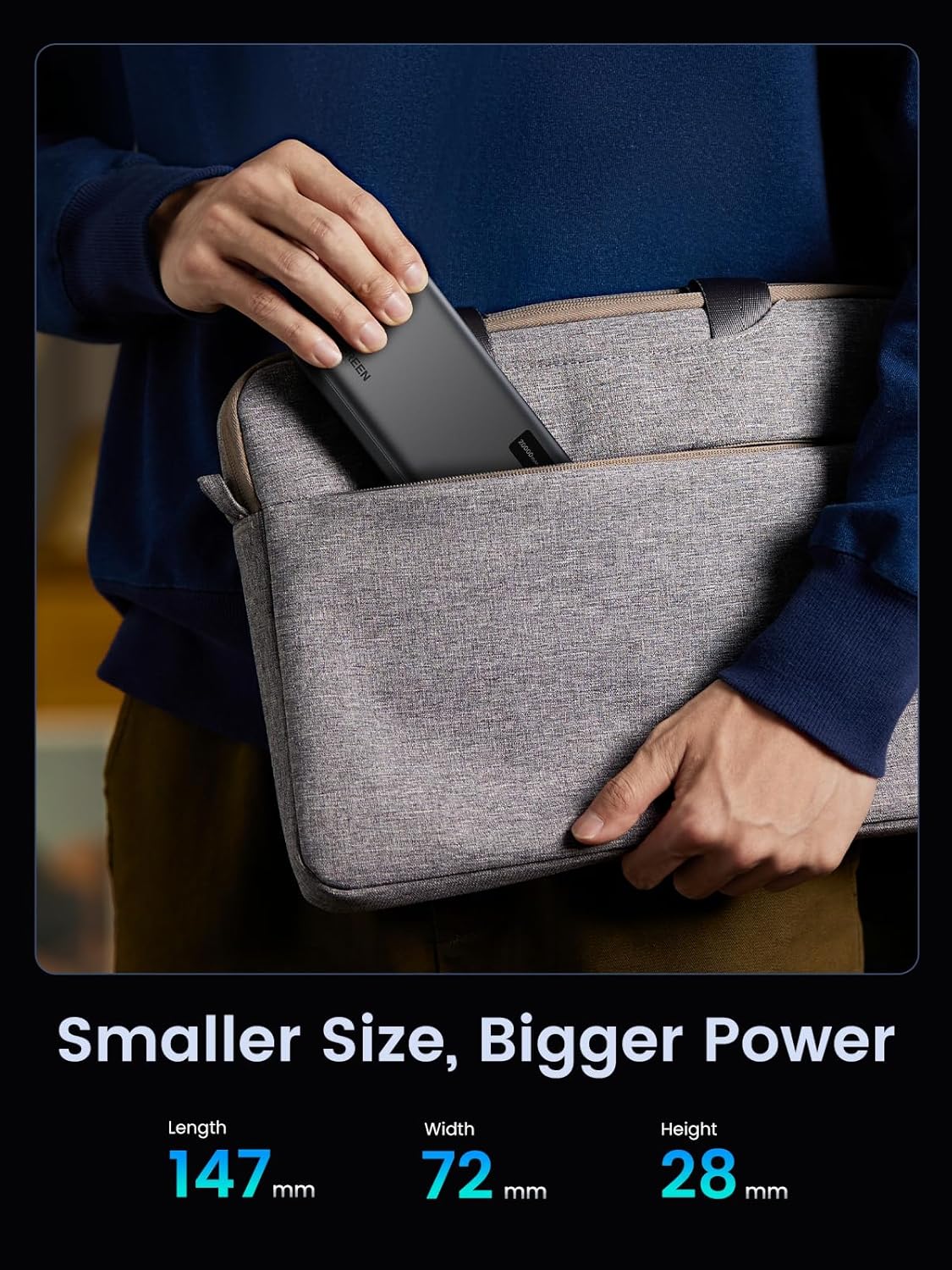 What sets it apart is the two-way fast charging capability: the USB-C port supports up to 20 W output for rapid charging of your devices, and also up to 20 W input so the power bank recharges quickly when you plug it in. With support for multiple fast-charge protocols (PD 20 W, QC 3.0/22.5 W on USB-A) and extensive safety protections (over-voltage, over-current, over-discharge, short-circuit, over-temperature), you’re getting both power and peace of mind. Compactly sized at just 147 × 72 × 27 mm, it’s easy to slip into a bag or backpack.