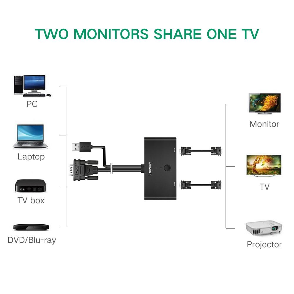 The UGREEN 30711 2‑Port VGA Switcher (Black) is a manual VGA signal switcher that lets you share one monitor between two VGA sources, or alternatively switch one source between two displays (one at a time). With a simple push‑button toggle, no drivers required, this compact device supports resolutions up to Full HD (1920×1080 @ 60 Hz) and includes a USB assist power port for more stable signal over longer distances. The housing is built from durable ABS plastic. It’s ideal for setups in classrooms, offices, or home environments where multiple PCs or displays need to share a single VGA input.