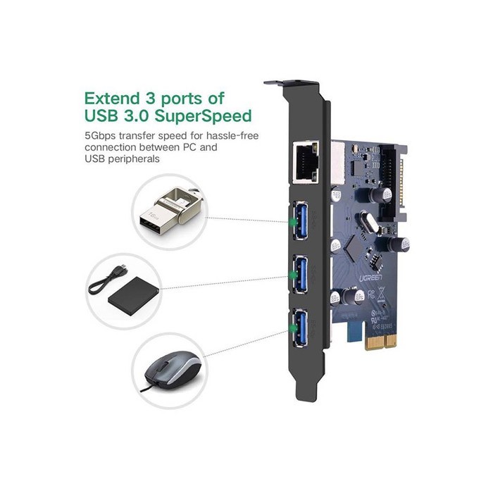 The Ugreen 30775 (US230) is a hybrid PCI Express expansion card combining **3 USB 3.0 ports** with a **Gigabit Ethernet (RJ45) port** on a single PCB. It’s ideal for desktops that need both extra high-speed USB ports and wired network connectivity, especially in scenarios such as desktop PCs without built-in network ports or with limited USB 3.0 capacity.