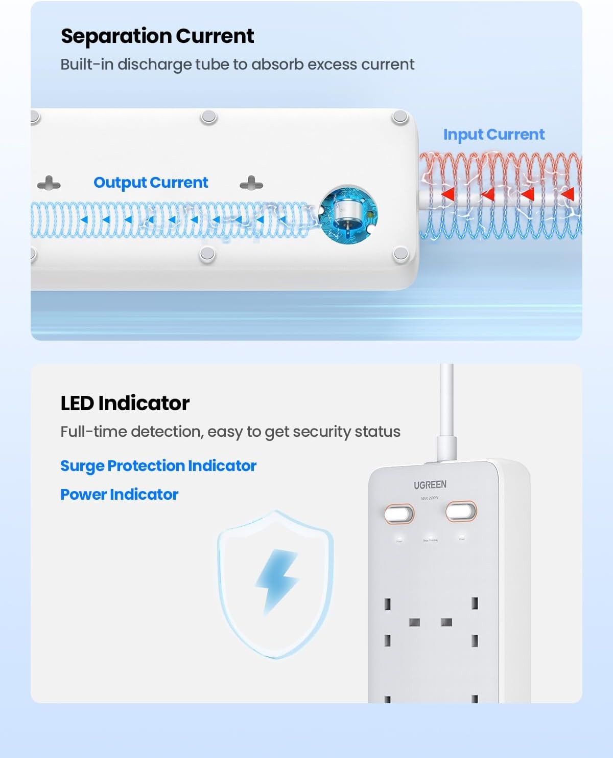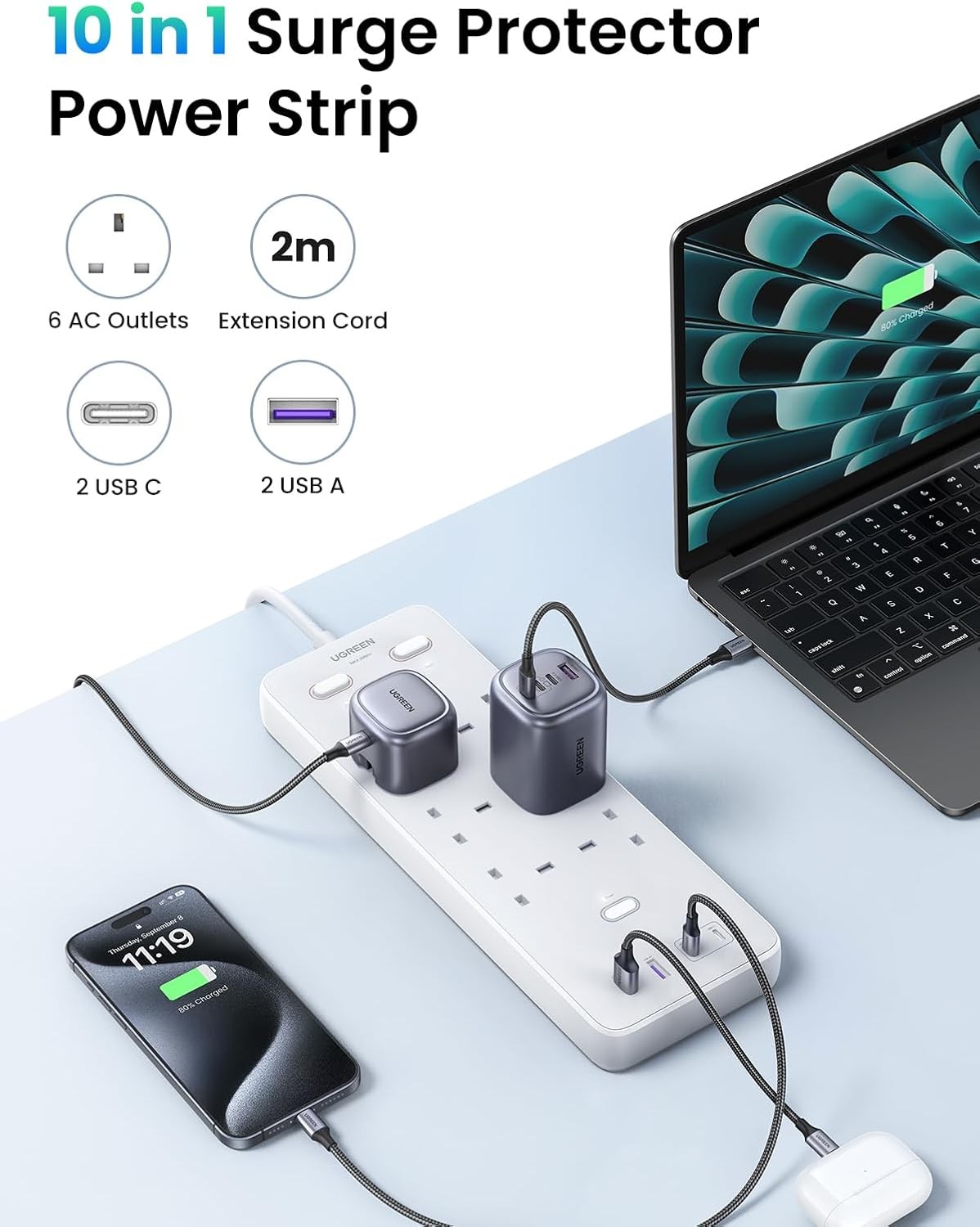 The UGREEN 35011 (also known as S551) Surge Protector is a versatile and powerful charging hub designed for modern homes and workspaces. With six AC outlets and a combination of two USB‑C and two USB‑A ports delivering up to 65 W total USB output, it enables simultaneous power for your computer, monitor, smartphone, tablet and other devices—all from a single extension cord. Built with advanced GaN technology, Thermal Guard real‑time temperature monitoring, and 1600‑J surge protection, this unit keeps your devices safe from power spikes, lightning transients and overloads. A 2‑metre heavy‑duty cable and wide‑spaced outlet design accommodate large wall‑warts or bulky plugs, making this surge protector both practical and future‑ready.