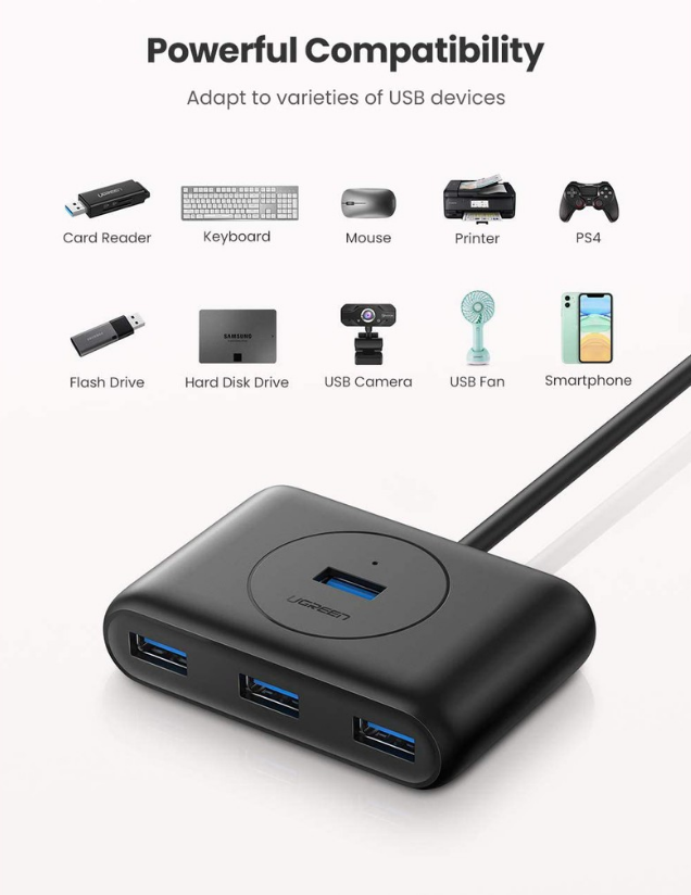 The Ugreen 40850 USB 3.0 Hub with USB-C Port is a versatile and compact solution designed to expand your device’s connectivity options. Featuring four USB 3.0 Type-A ports, this hub allows you to connect multiple devices such as external hard drives, USB flash drives, keyboards, and mice simultaneously. The included USB-C cable ensures compatibility with a wide range of devices, including laptops, tablets, and smartphones. With data transfer speeds of up to 5 Gbps, you can quickly transfer large files and enjoy smooth performance. Its plug-and-play functionality means no additional drivers are required, making it an ideal choice for both home and office use.
