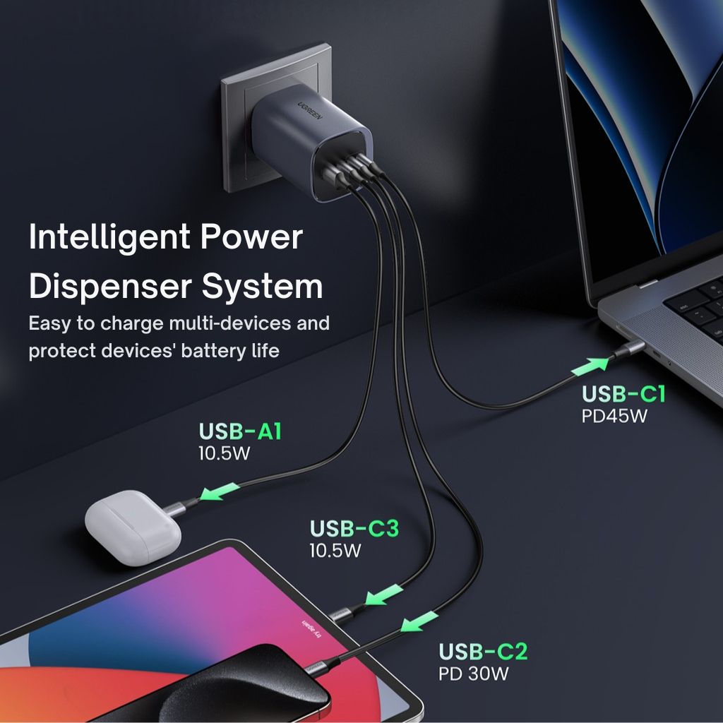 The UGREEN 45226 Nexode S 100W 4-Port GaN Fast Charger UK is a high-performance multi-device charging solution designed to power up to four devices simultaneously with intelligent power distribution and advanced efficiency. Built with GaNInfinity technology, this compact charger delivers up to 100 W total output, allowing you to fast charge laptops, tablets, phones, and accessories safely and efficiently. Featuring multiple USB-C and USB-A ports, built-in multi-layer safety protections, and broad compatibility across popular USB-C and USB-A devices, it’s an ideal companion for home, office, or travel use.