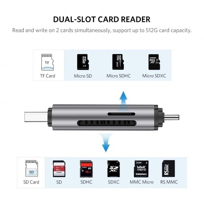 Supported Card Slots1× SD/SDHC/SDXC/MMC/RS-MMC, 1× Micro SD/TF/Micro SDHC/Micro SDXC (dual-slot simultaneous use)