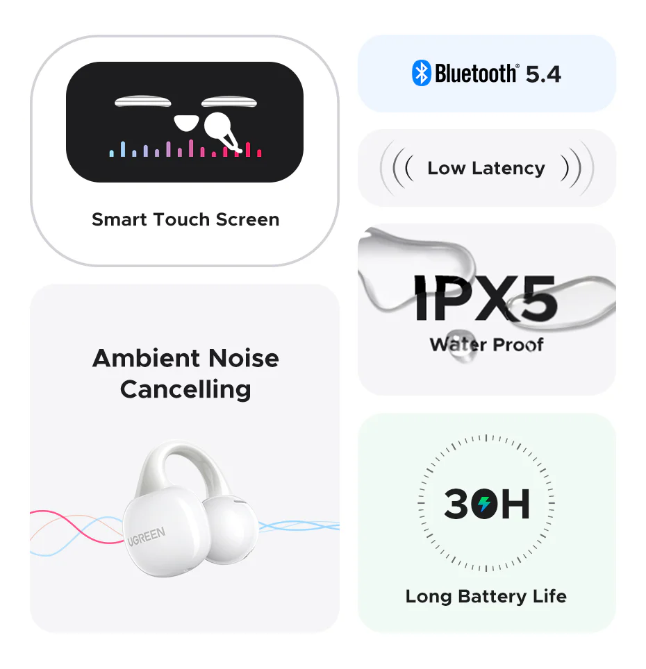 The Ugreen ClipBuds Magic (55136) are innovative true wireless earbuds featuring an open-ear clip design for all-day comfort without ear fatigue. Ideal for users who dislike in-ear pressure, these earbuds sit securely around the ear and allow ambient sound awareness — great for commuting, working, or casual listening.