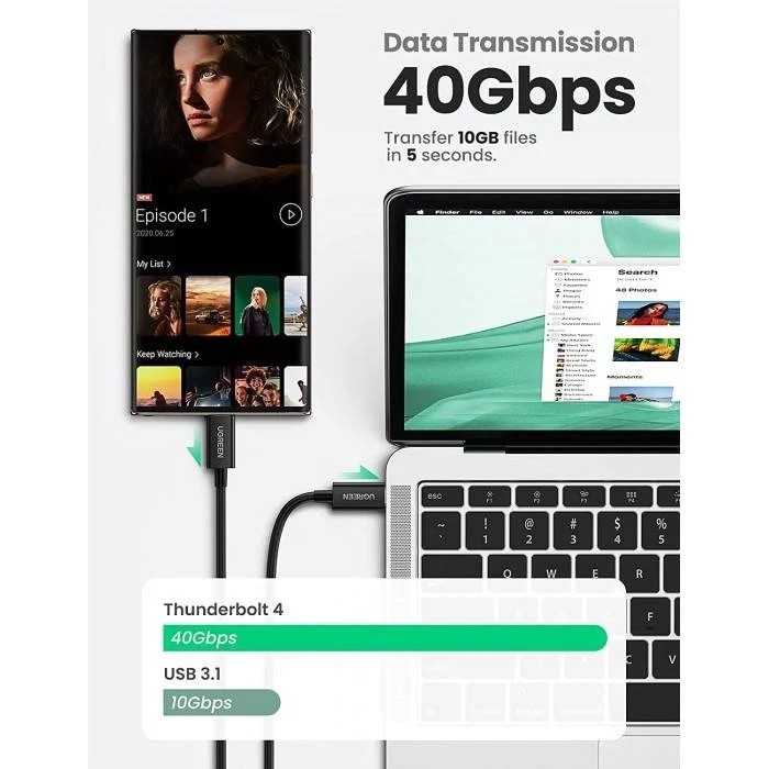 The UGREEN 60621 Thunderbolt 4 Cable (2 m) is a premium-capability USB-C to USB-C cable engineered for high-performance data, video and power delivery. With full Thunderbolt 4 certification, this cable supports blazing-fast data transfer speeds (up to 40 Gbps), high-bandwidth video output (8K @ 60Hz or dual 4K @ 60Hz), and laptop-class charging via PD up to 100 W (20V/5A).