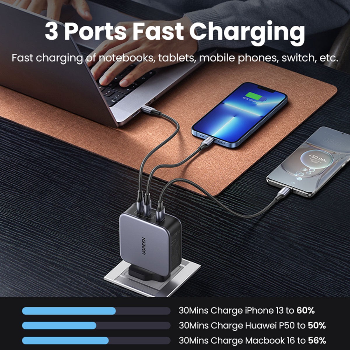 The UGREEN 90322 Nexode 140W GaN Fast Charger with Cable is a premium high‑power charger engineered for laptops, tablets, smartphones and more. With a maximum single‑port output of **140W**, it supports the latest USB Power Delivery 3.1 (PD 3.1) protocol — fast‑charging devices like the MacBook Pro 16″ from empty to ~56% in just 30 minutes.
