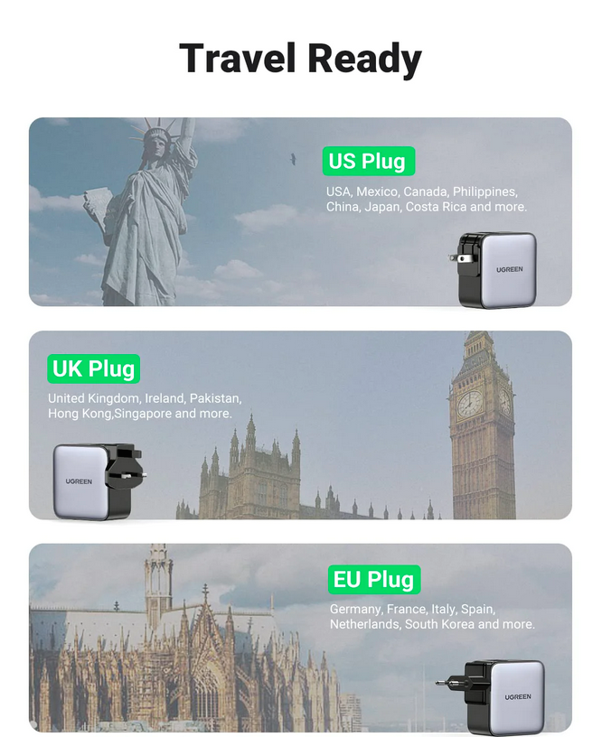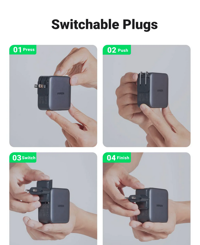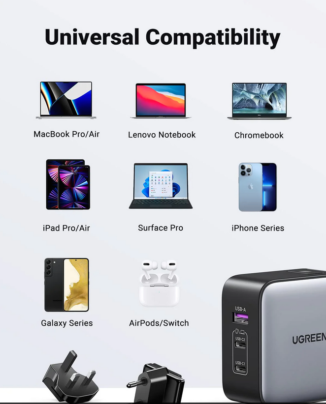 | Plug Types | Interchangeable US, UK, and EU plug heads included |