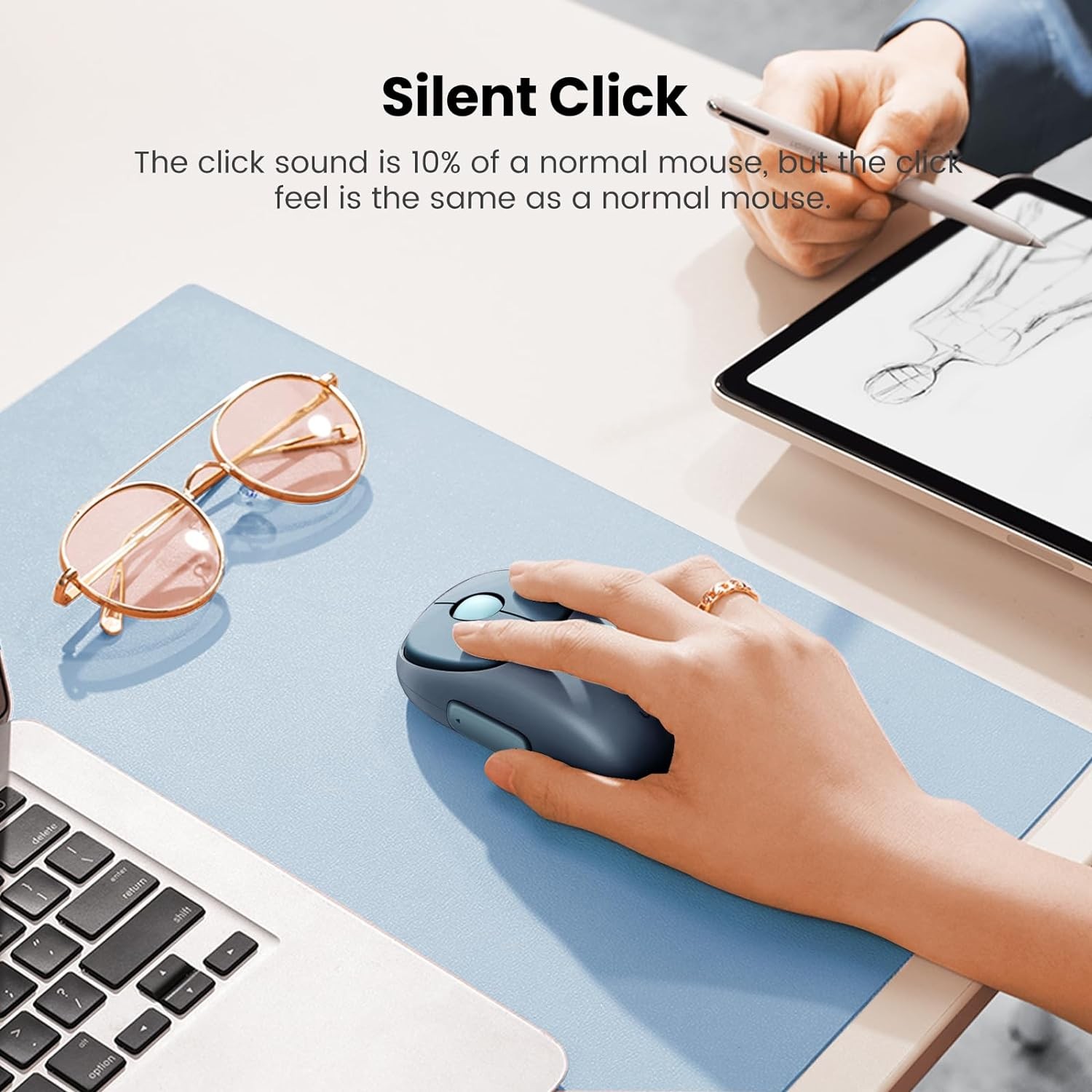 Its **silent-click buttons** reduce noise by up to ~90%, making it ideal for shared workspaces, libraries, or late-night use. The built-in **500 mAh rechargeable battery**, charged via USB-C, gives you long use between charges — and the compact USB receiver ensures a stable connection when Bluetooth isn’t available. The elegant blue finish is both modern and professional, and the sculpted design ensures all-day comfort.