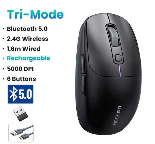 The **UGREEN 90539 (MU103)** 3-Mode Wireless Mouse blends flexibility, performance, and comfort seamlessly. With **triple connectivity** — wired via USB-C, 2.4 GHz via nano receiver, and Bluetooth 5.0 — you can connect up to **three devices simultaneously** and switch between them with ease. Perfect for multitasking across a laptop, desktop, and tablet without sacrificing responsiveness.