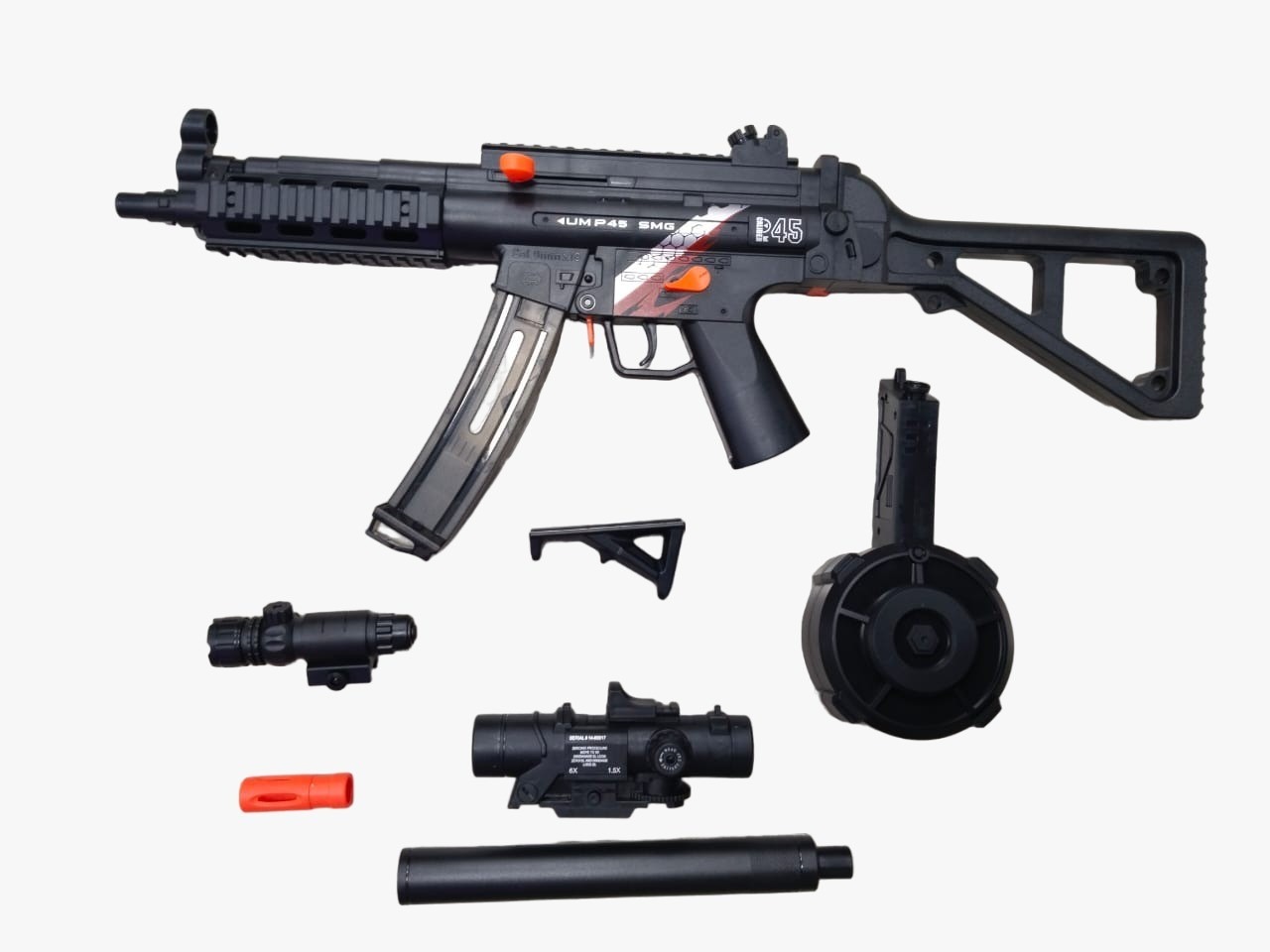 The UMP45 Gel Blaster is a compact, UMP‑style submachine/SMG replica produced by multiple manufacturers and offered in electric AEG, gas blowback, and toy variants. Designed for close‑quarters skirmish play, backyard target practice and display, variants commonly feature polymer/ABS construction, removable magazines, and tactical accessories such as red‑dot sights and foregrips depending on the bundle.
