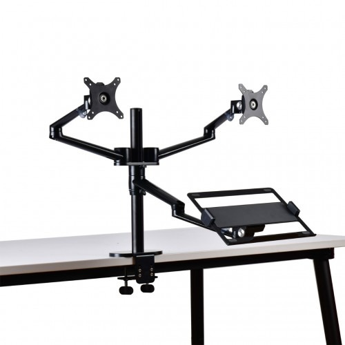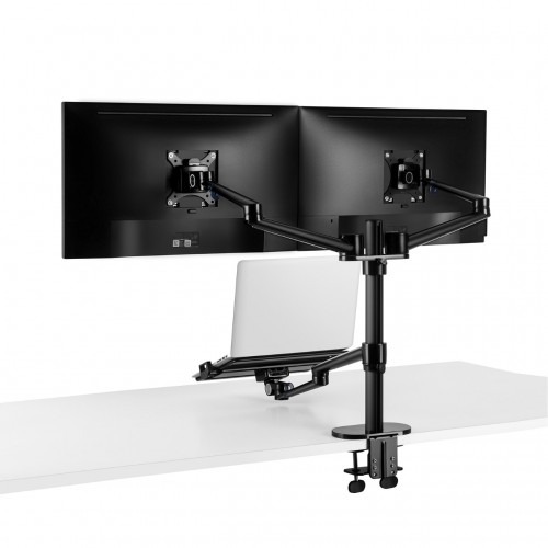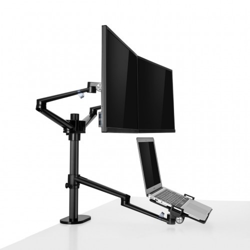 The UPERGO OL-10T Aluminum Height Adjust Desktop Dual 17-32″ Monitor Holder + 12-17″ Laptop Holder is a versatile and ergonomic solution designed to support dual monitors and a laptop simultaneously. Constructed from durable aluminum alloy and ABS plastic, it offers a sturdy and stylish addition to any workspace. The arms feature full 360° rotation and height adjustability, allowing users to position their monitors and laptop for optimal viewing angles and comfort. Ideal for professionals, gamers, and content creators seeking flexibility and space-saving solutions.