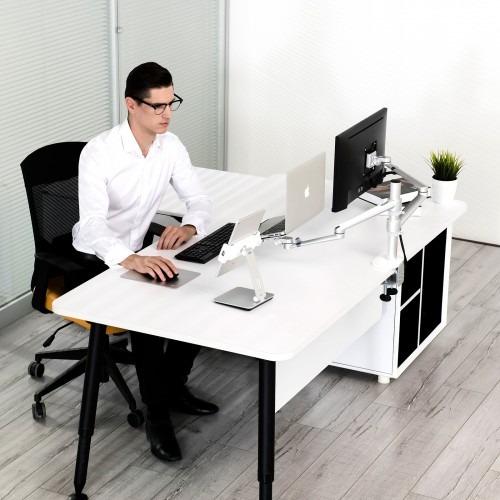 “Perfect for dual-screen setups. Holds my 27-inch monitor and 15-inch laptop firmly in place — very smooth adjustment and a clean, modern look.”