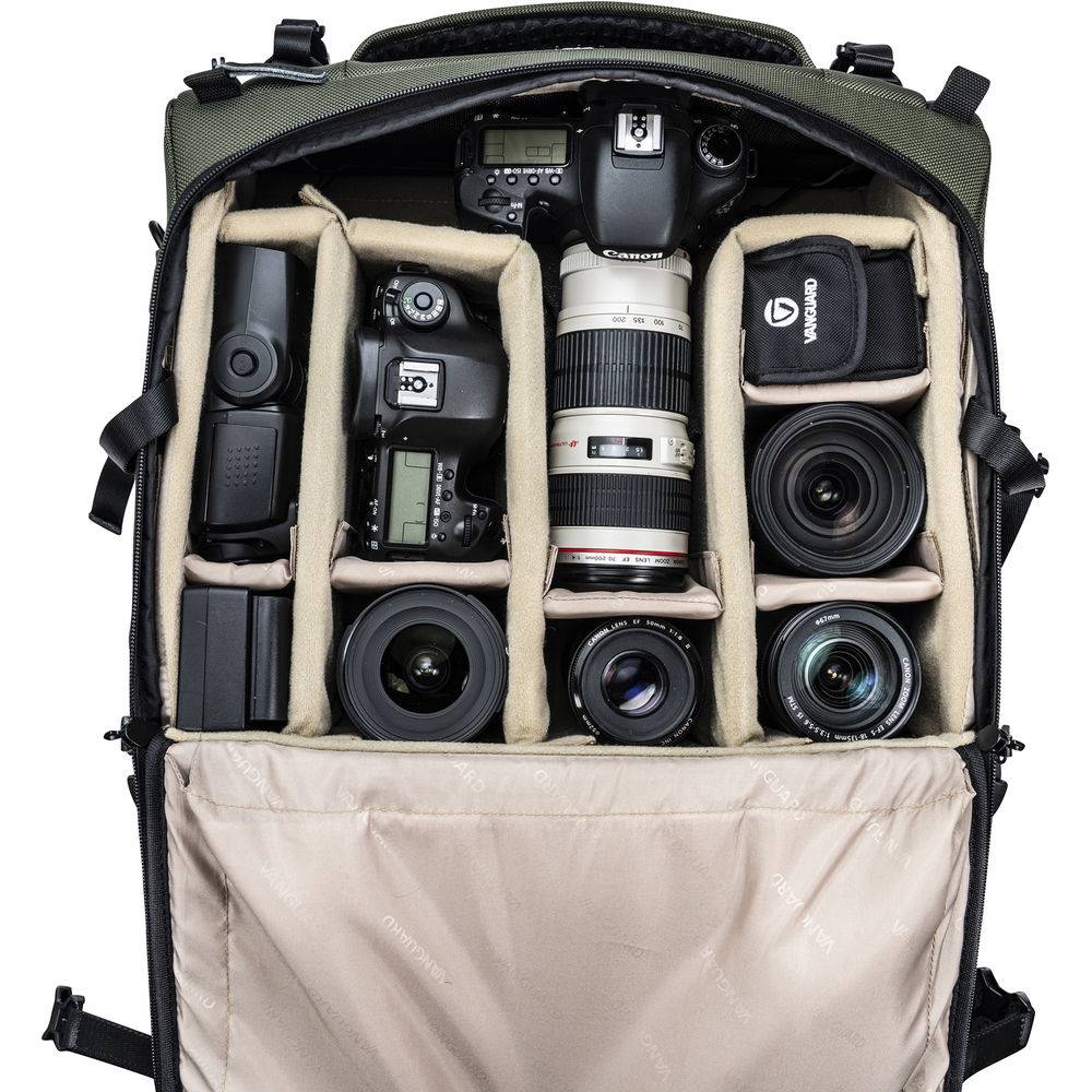 | Features | Quick access top/front openings, adjustable internal dividers, well-padded compartments, tripod carrying system (VEO TRIPOD LINK), ergonomic shoulder strap, reinforced handle, water- and scratch-resistant material, total-coverage rain cover, versatile pockets |