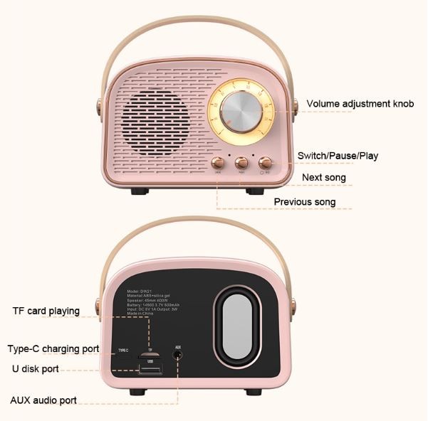 The DW21 Vintage Radio BT Speaker combines retro aesthetics with modern audio technology, offering a compact and stylish solution for music lovers. This portable speaker features Bluetooth 5.0 connectivity, allowing you to wirelessly stream music from your smartphone or other Bluetooth-enabled devices. Additionally, it supports TF card and USB flash drive playback, providing versatile options for music enjoyment.