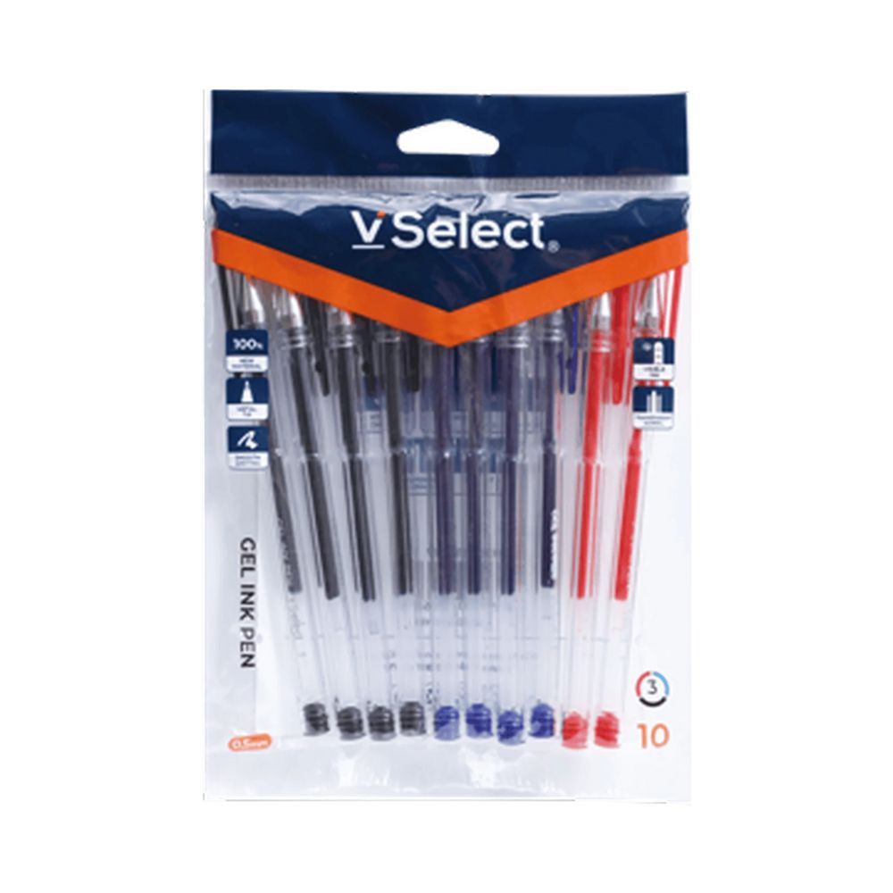 The VSelect GEL INK PEN 3 Colours 0.5 mm (Pack of 10) is a high-value writing set tailored for students, professionals and everyday note-taking. Each pen features a fine 0.5 mm tip for precise, crisp lines, and offers three ink colours (commonly black, blue and red) within a single pen or set—ideal for colour-coding, editing and organised writing. Supplied as a 10-piece pack, it provides excellent value and is suited for classroom, office, study or bulk use.