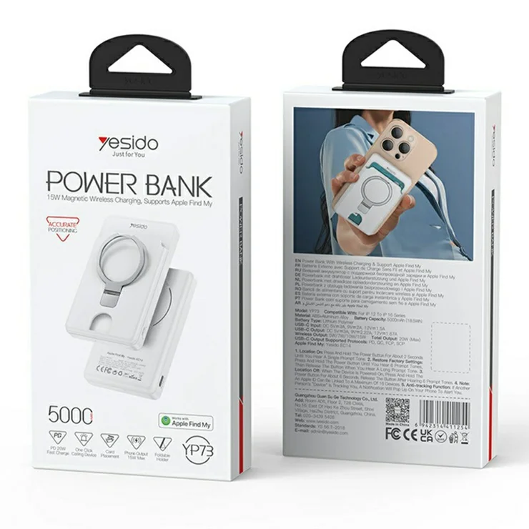 The YESIDO YP73 is a compact power bank with a 5000 mAh battery, offering both magnetic wireless charging and wired fast charging. It’s designed for portability and convenience — perfect for keeping your phone (or other Qi‑enabled devices) powered on the go. A built-in foldable metal stand and “locator” feature add extra practicality, making it useful for watching videos, video calls, or tracking the power bank if misplaced.
